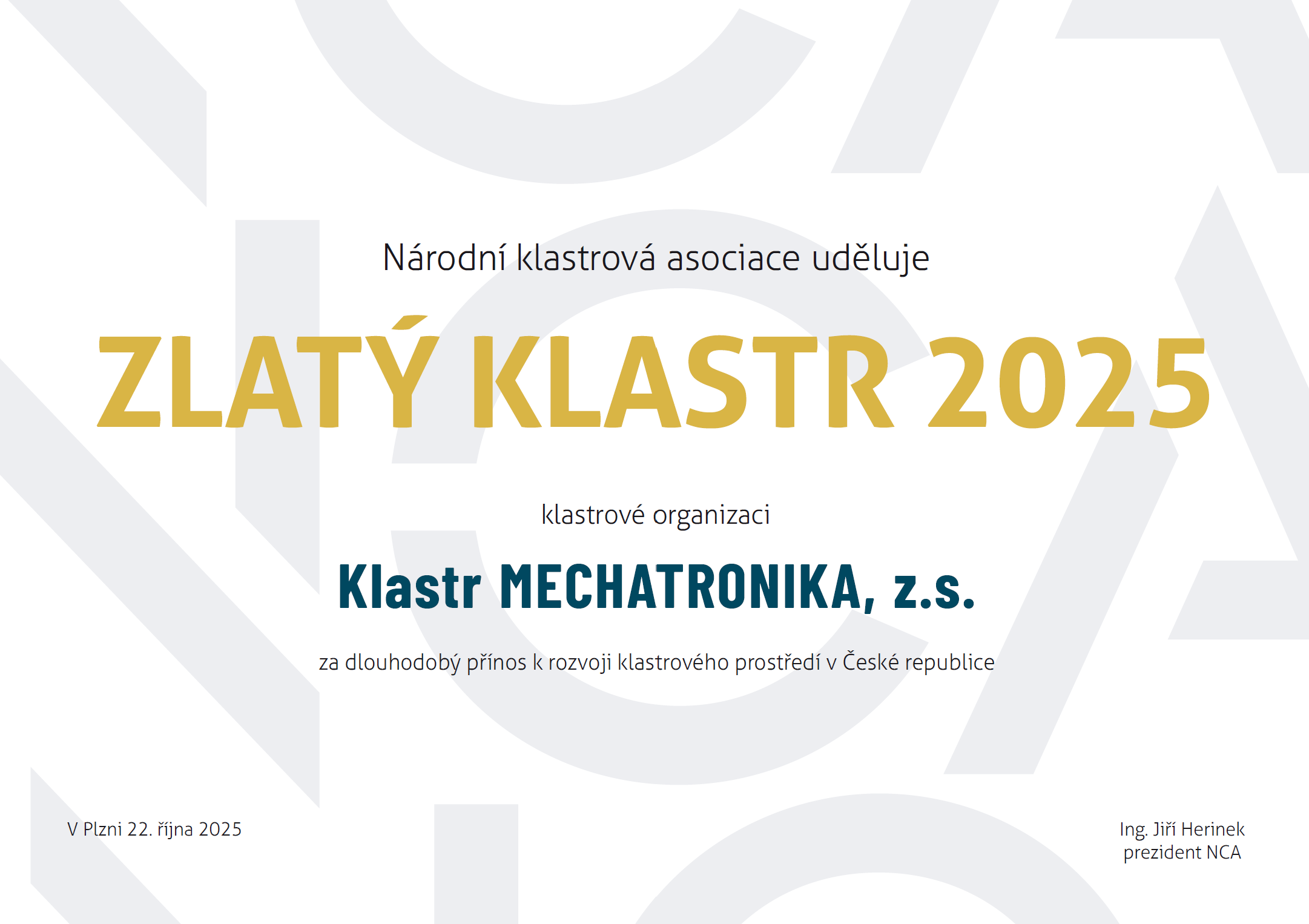 ZLATÝ KLASTR 2025 ZÍSKAL KLASTR MECHATRONIKA z. s.