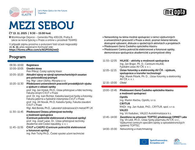Český optický klastr ve spolupráci se společností Meopta s.r.o. Vás srdečně zve na další setkání v rámci série workshopů MEZI SEBOU, které se tentokrát uskuteční poprvé v nové formě – prezenčně i online.