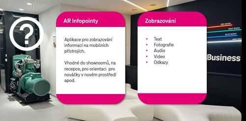 Představuje praktické využití rozšířené reality pro průmyslové provozy. Řeší potřebu přehledného zobrazení dat z přístrojů formou prostorových dashboardů, poskytuje digitální infopointy pro navigaci a informace o strojích, umožňuje vzdálenou podporu, prezentuje 5G lokalizaci bez fyzické infrastruktury. Spolu s cloudovou platformou T-Cloud a datovým centrem tvoří ucelené řešení pro efektivní provoz, údržbu, školení i bezpečnostní dohled. Přínosem je úspora času, snížení chybovosti a rychlejší rozhodování díky prostorové vizualizaci dat.